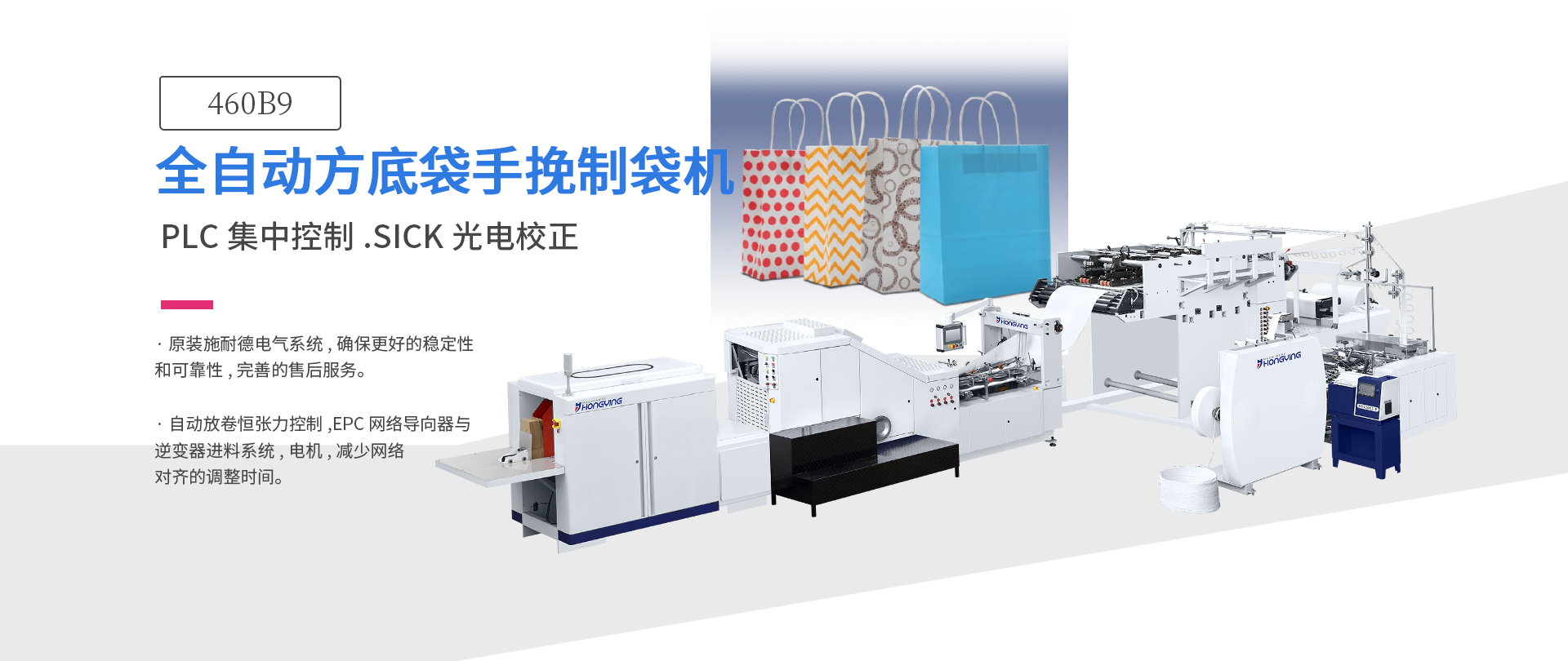 全自動手提紙袋機(jī)以其優(yōu)異的品質(zhì)和性能獲得了全世界用戶的認(rèn)可。本機(jī)用于生產(chǎn)帶手提把的方底紙袋,是由手挽機(jī)將卷繩和貼片卷筒紙制成手把,通過輸送裝置將手挽送至貼把機(jī)組,貼把機(jī)組將原色或印刷好的卷筒紙進(jìn)行貼片位點斷、貼片位涂膠、自動粘貼手把,再由主機(jī)將貼有手把的紙張進(jìn)行涂邊膠、成紙筒、切斷、底部壓痕、底部涂膠、袋底成形并輸送出袋,整個制袋過程一次同步完成。是生產(chǎn)手提